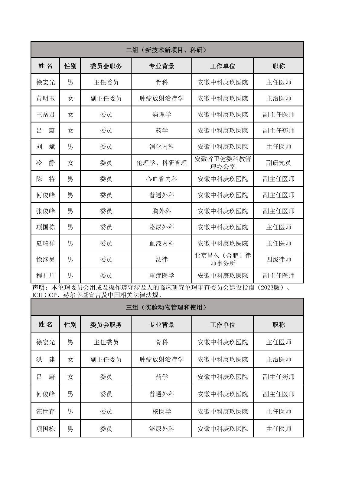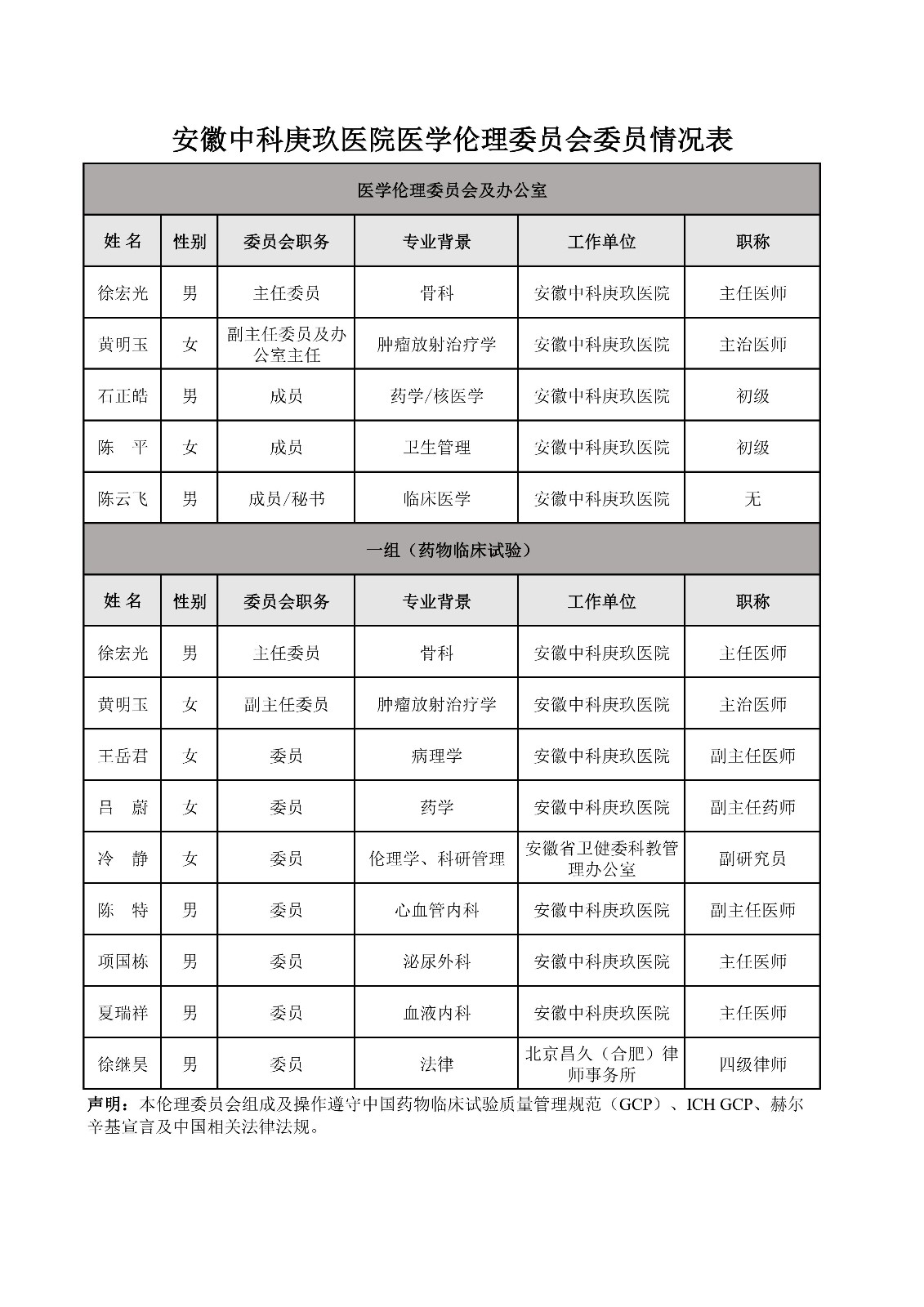 安徽中科庚玖医院医学伦理委员会委员信息表
